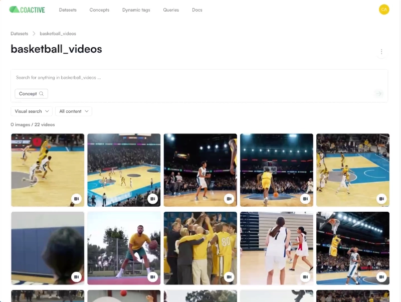 Coactive AI is a Multimodal Application Platform (MAP) that unlocks value in content by making it easy to search and analyze images and videos — no metadata or tags required. With Coactive, data leaders are able to leverage multimodal AI today while also creating a foundation for future use cases. This enables users across the organization to discover, analyze, and enrich visual content.